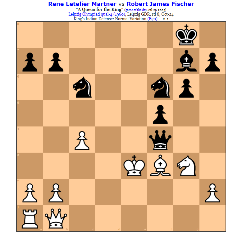 Above is the final position from “A Queen for the King” featured in “My 60 Memorable Games” and other media. White resigns this position, as capturing black’s queen leads to checkmate in 1, and with any other continuation completely lost for white. It’s a beautiful and remarkable position that was achieved by a counterintuitive move (to most)- a queen sacrifice is rarely seriously considered by amateurs in all but the rarest of cases. Black cleanly calculated and made this move with dramatic consideration; what’s more, this was not a mismatch of skill as both players were grandmasters.