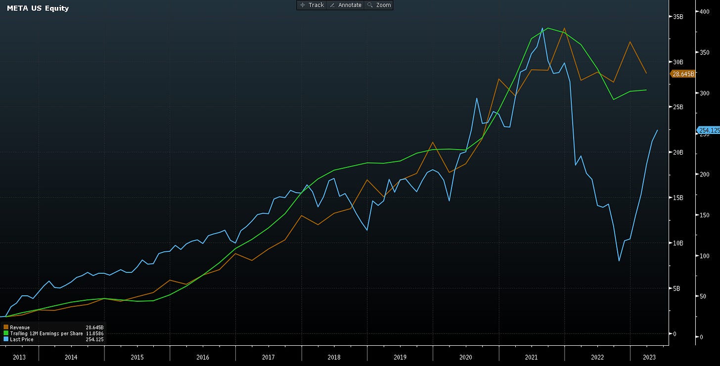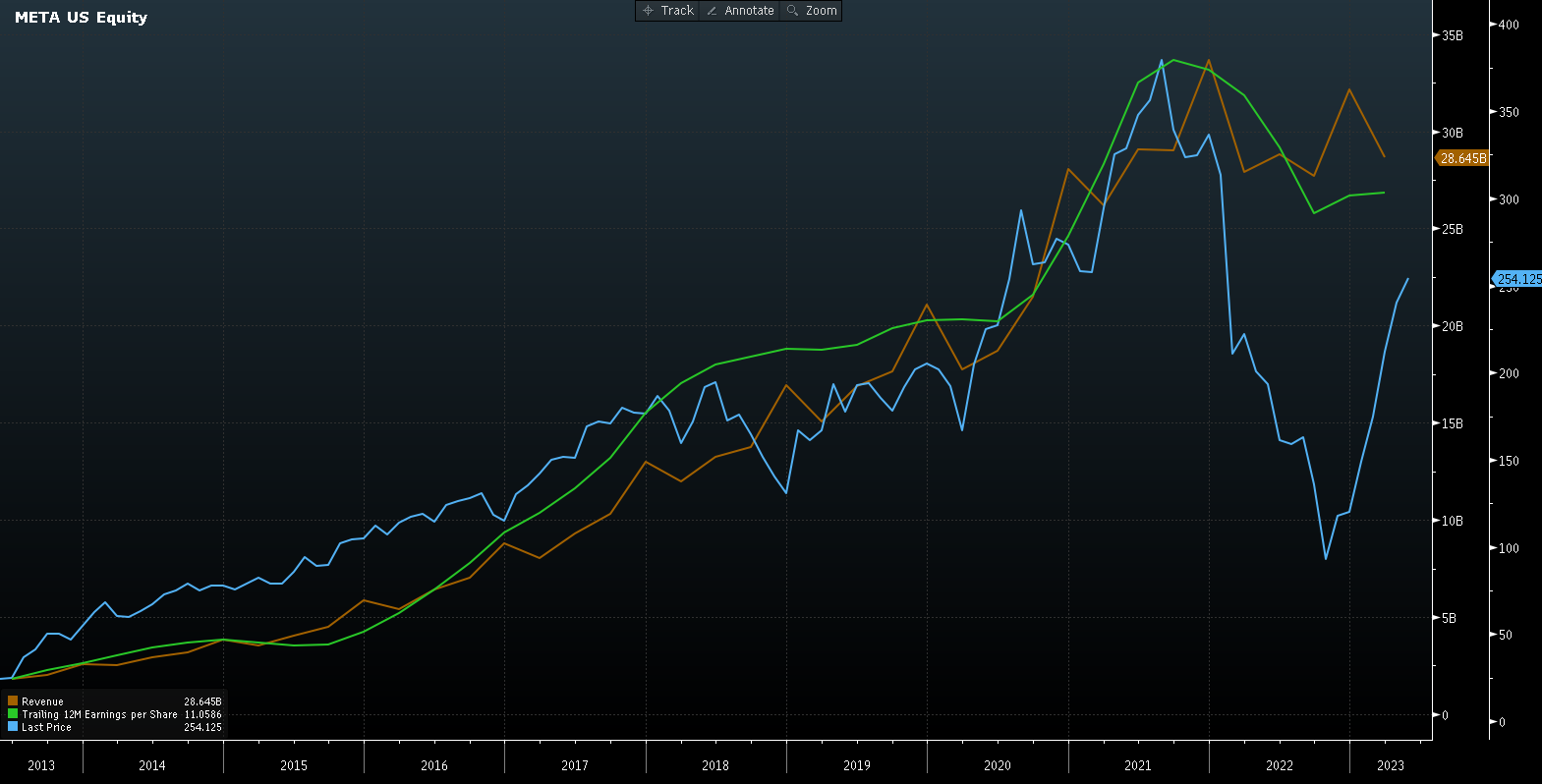 Weschler made an estimate of forward dilution and threw an arbitrary 20x “long-term market multiple” on the stock. Of course, there’s plenty of academic reasoning or formulaic approaches that can tell you why Grace deserved that multiple due to its ROIC or long-term growth prospects or whatever, but that’s not even close to important- he just knew the company could be reasoned to have that sort of multiple by market participants. It had consistently traded at that multiple in the past and nothing had fundamentally changed with the core thesis. If you approached META with this same intellectual laziness, you could simply say “the stock earns $10-15 per share, it’s not a bad business and it’ll be around” you’d probably have purchased some stock at around~ $100 on the theory that you’d have a good shot at the business re-rating and earnings stabilizing.