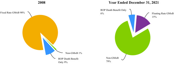 •Structured Capital Strategies. Our index-linked variable annuity product allows the policyholder to invest in various investment options, whose performance is tied to one or more securities indices, commodities indices or ETF, subject to a performance cap, over a set period of time. The risks associated with such investment options are borne entirely by the policyholder, except the portion of any negative performance that we absorb (a buffer) upon investment maturity. Prior to November 2021, this variable annuity did not offer GMxB features, other than an optional return of premium death benefit that we had introduced on some versions. In November 2021, we introduced a new version of this variable annuity offering a GMxB feature. [GMxB= Guaranteed Minimum _____ Benefit]